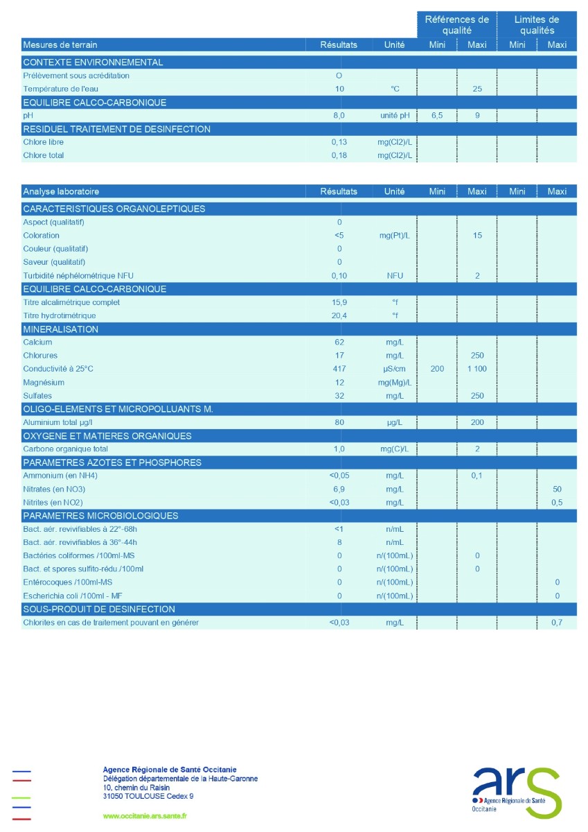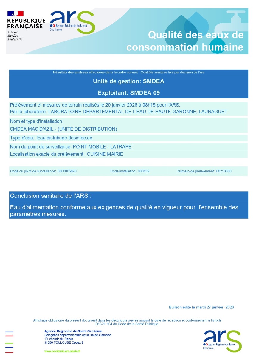 Résultats des dernières analyses faites sur le réseau le 20/01/2026, concluant à une eau d'alimentation conforme aux exigences de qualité en vigueur